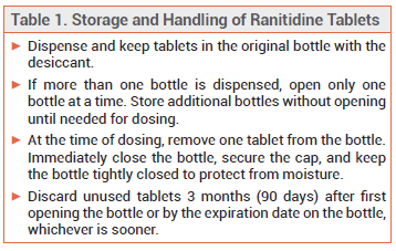 The new formulation is available by prescription in bottles of 30 tablets containing either 150 mg or 300 mg of ranitidine. The bottles should be stored at 15-30°C (59-86°F) in a dry place and protected from light. The updated label states that the tablets must be dispensed in the original container. The label also includes storage and handling instructions for patients (see Table 1).