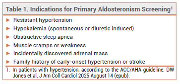 Recently published guidelines recommend screening patients with hypertension for primary aldosteronism. The Endocrine Society recommends screening all patients1 and the American College of Cardiology/American Heart Association (ACC/AHA) recommend screening those at increased risk (see Table 1).2