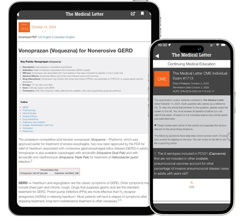 The Medical Letter enables you to get the information when and where you need it, on your mobile device. Browse past issues, earn CME/CE credits and find information quickly by using our search — all formatted specifically for your device.